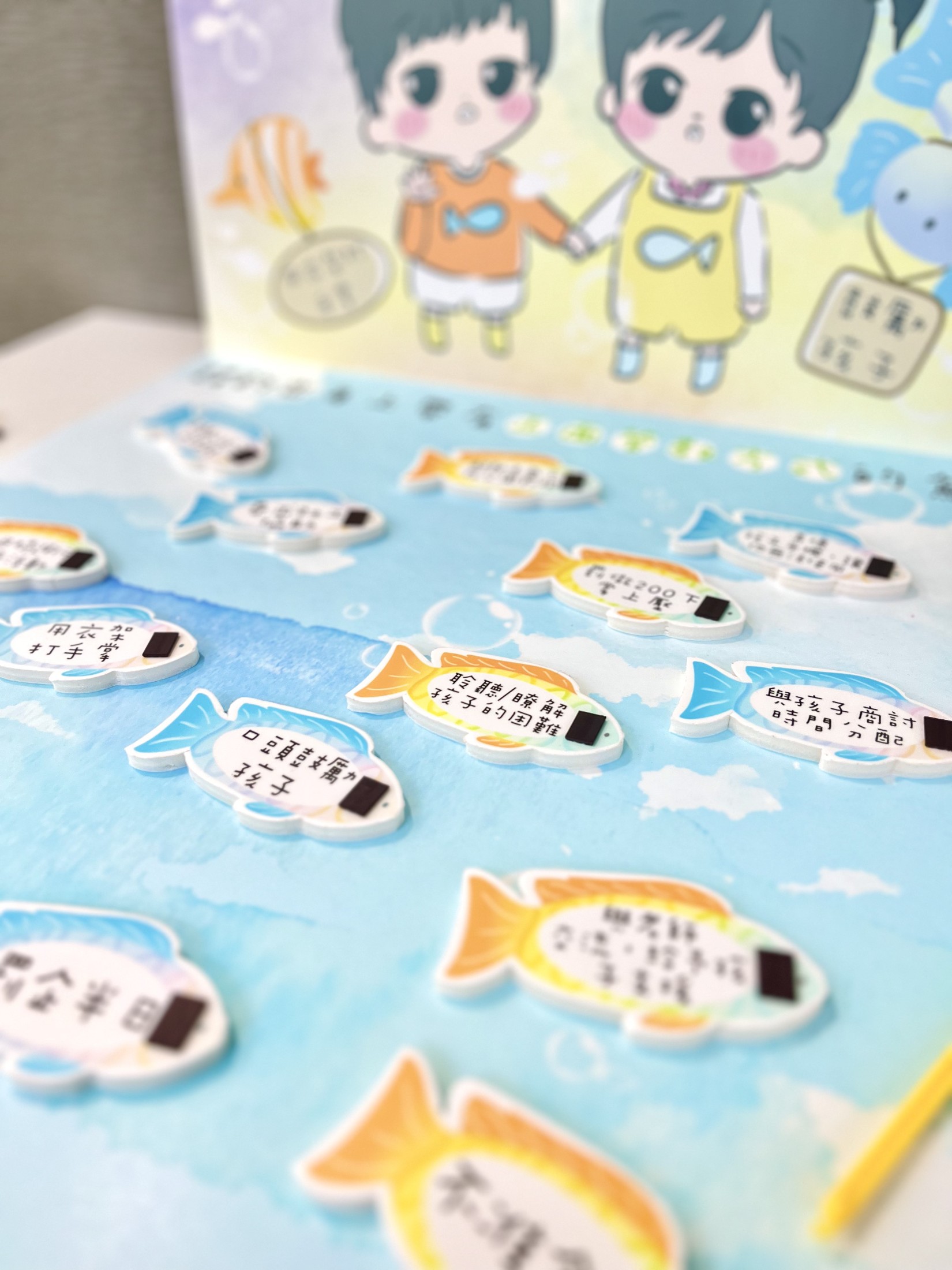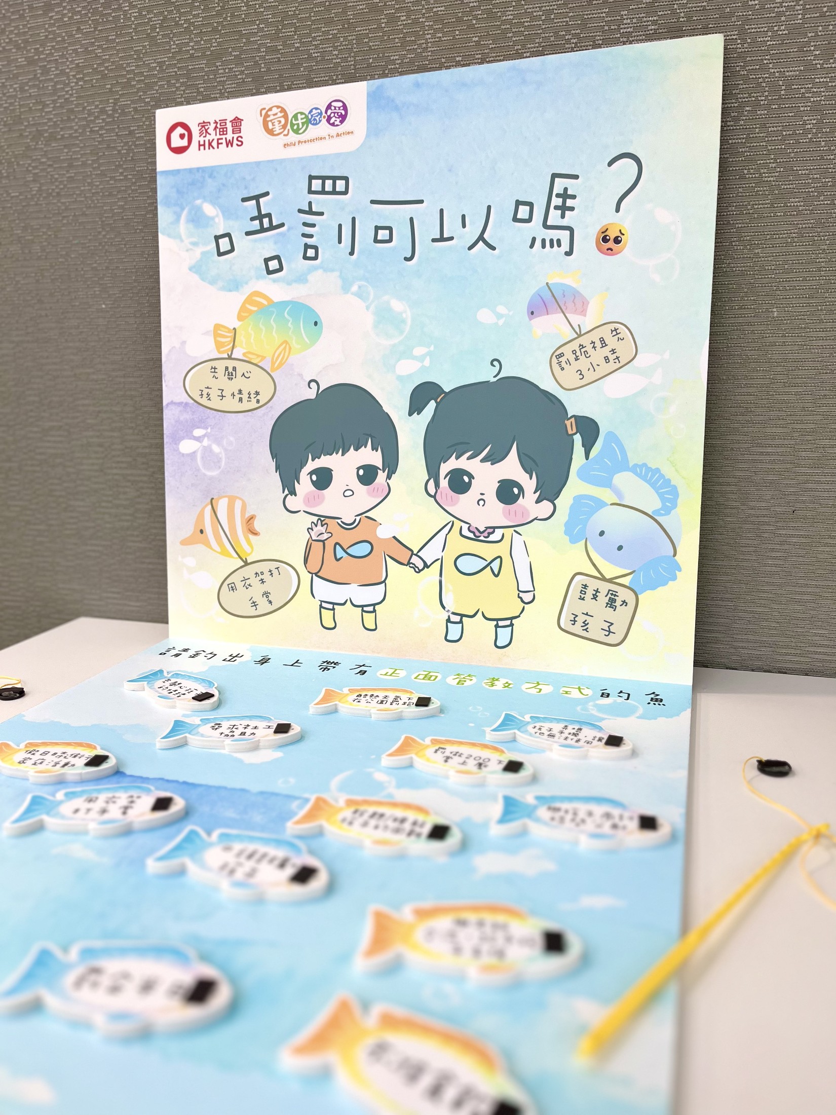 親子攤位遊戲《唔罰可以嗎?》透過趣味釣魚遊戲,由孩子與家長一起釣出代表正面管教方式的小魚兒,增強親子互動,並為家長提供合宜的正向管教方法,推動家長學習正面照顧及管教兒童的技巧,建立和諧家庭。