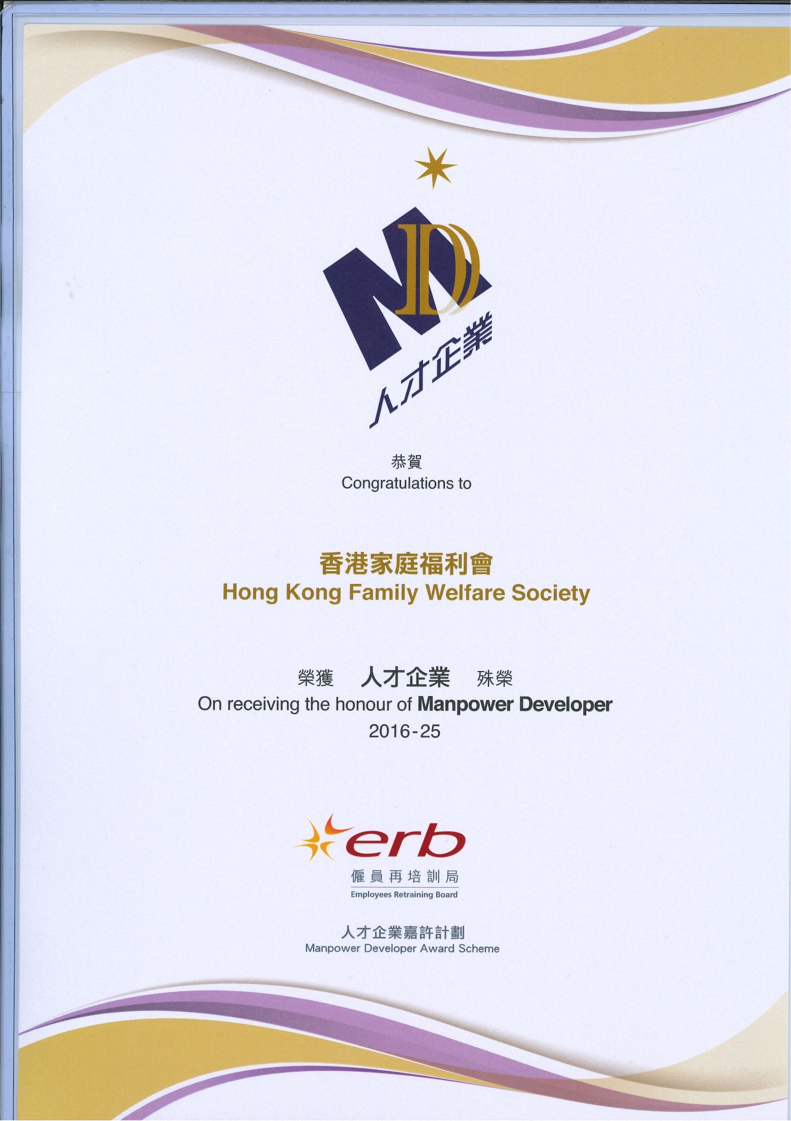 The Society had passed the assessment of the "ERB Manpower Developer Award Scheme” again since 2016 and awarded the status of "Manpower Developer” with an authorisation to use its logo and title till 31 March 2025