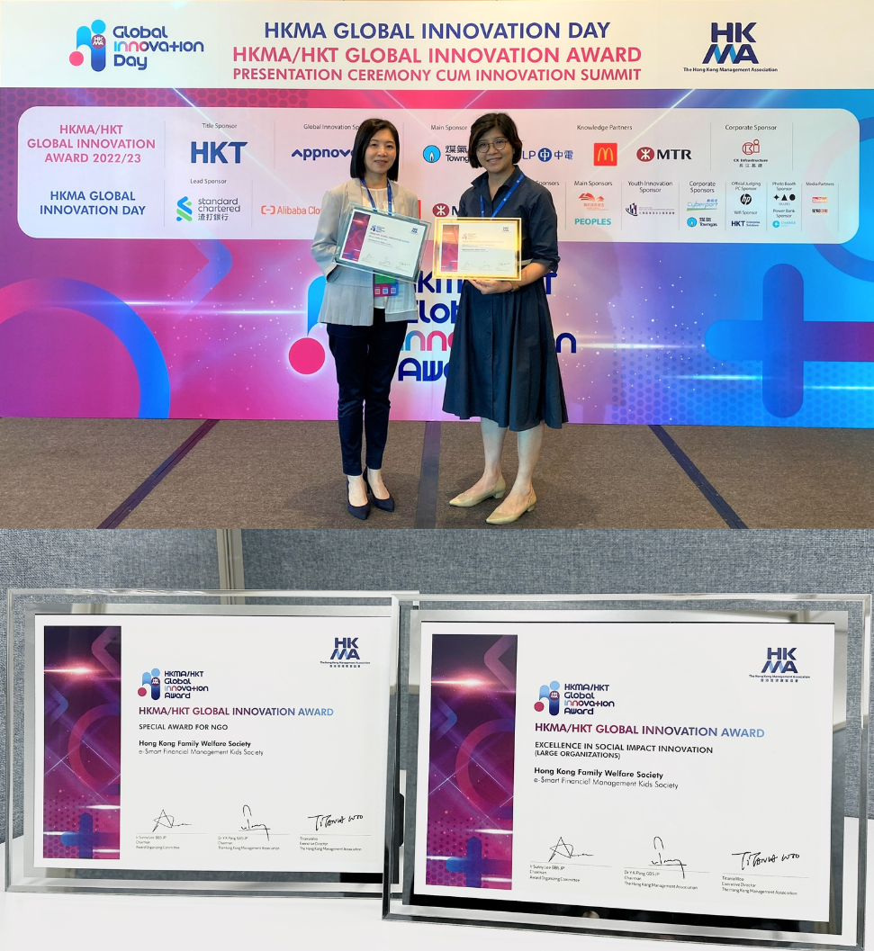 Financial Education Centre "e$mart Financial Management Kids Society" received the "Excellence in Social Impact Innovation (Large Organization)” and "Special Award for NGO” in the HKMA/HKT Global Innovation Award 2022/23 organised by The Hong Kong Management Association