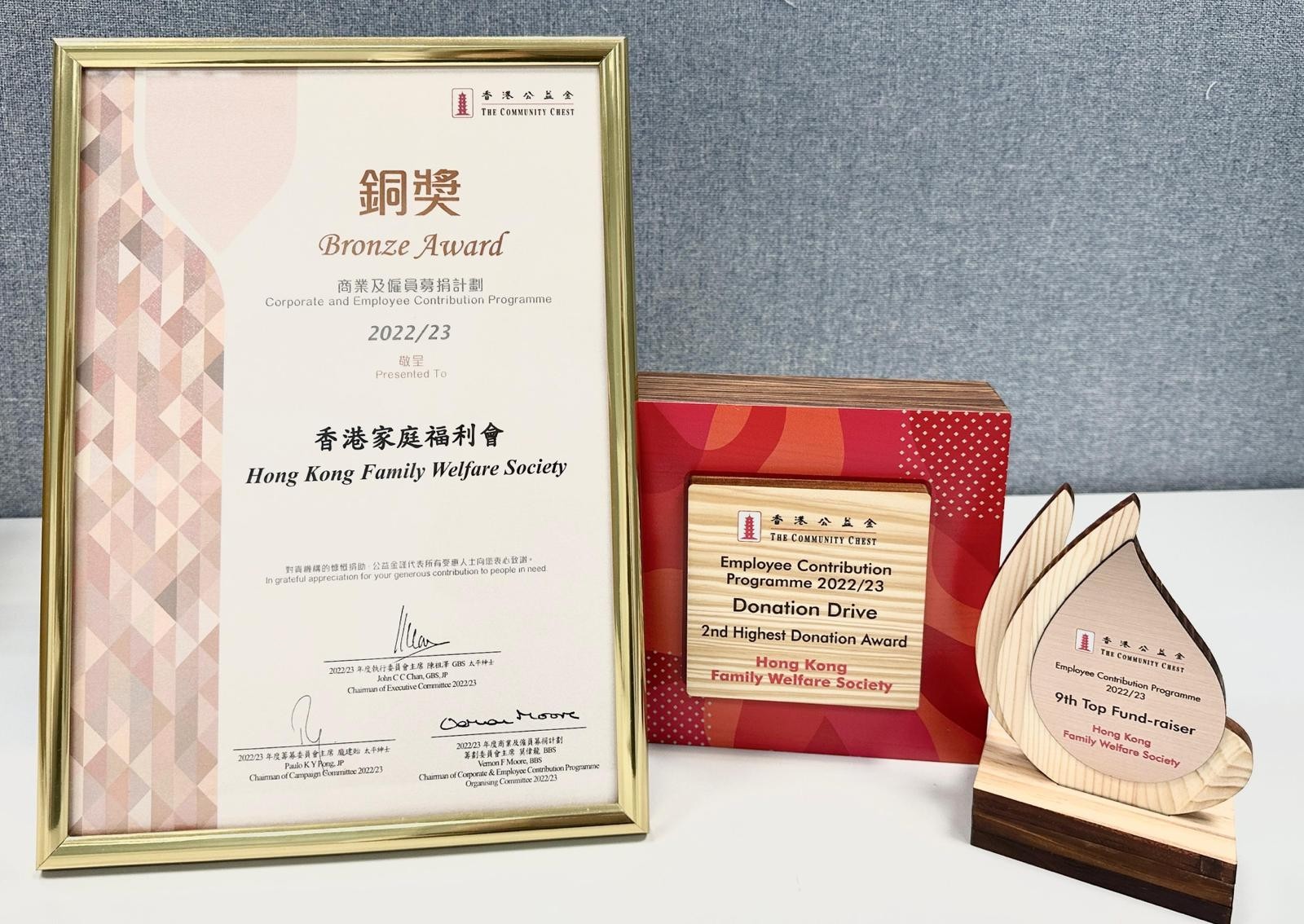 The Society received "Bronze Award”, “2nd Highest Donation Award for Donation Drive” and ”9th Top Fund-raiser Award” of “Corporate and Employee Contribution Programme 2022/23 (CECP)" by the Community Chest