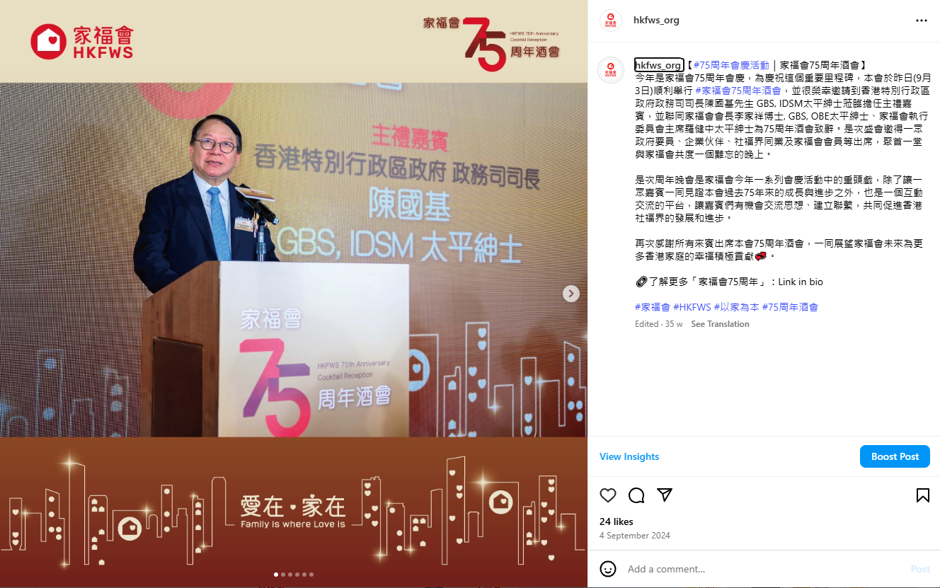 Social media has become a vital channel for information dissemination and public engagement in contemporary society, while simultaneously reshaping how we connect with communities. Social media platforms, including Facebook, Instagram, and LinkedIn, serve not only as channels for promoting our professional services, but as dynamic platforms for community connection and disseminating information on family wellbeing. Through instant sharing of service updates, event highlights, and media coverage, we fostered public awareness and engagement with family wellbeing issues. This approach also facilitated interaction between the Society and diverse stakeholders, enhancing mutual connectivity.