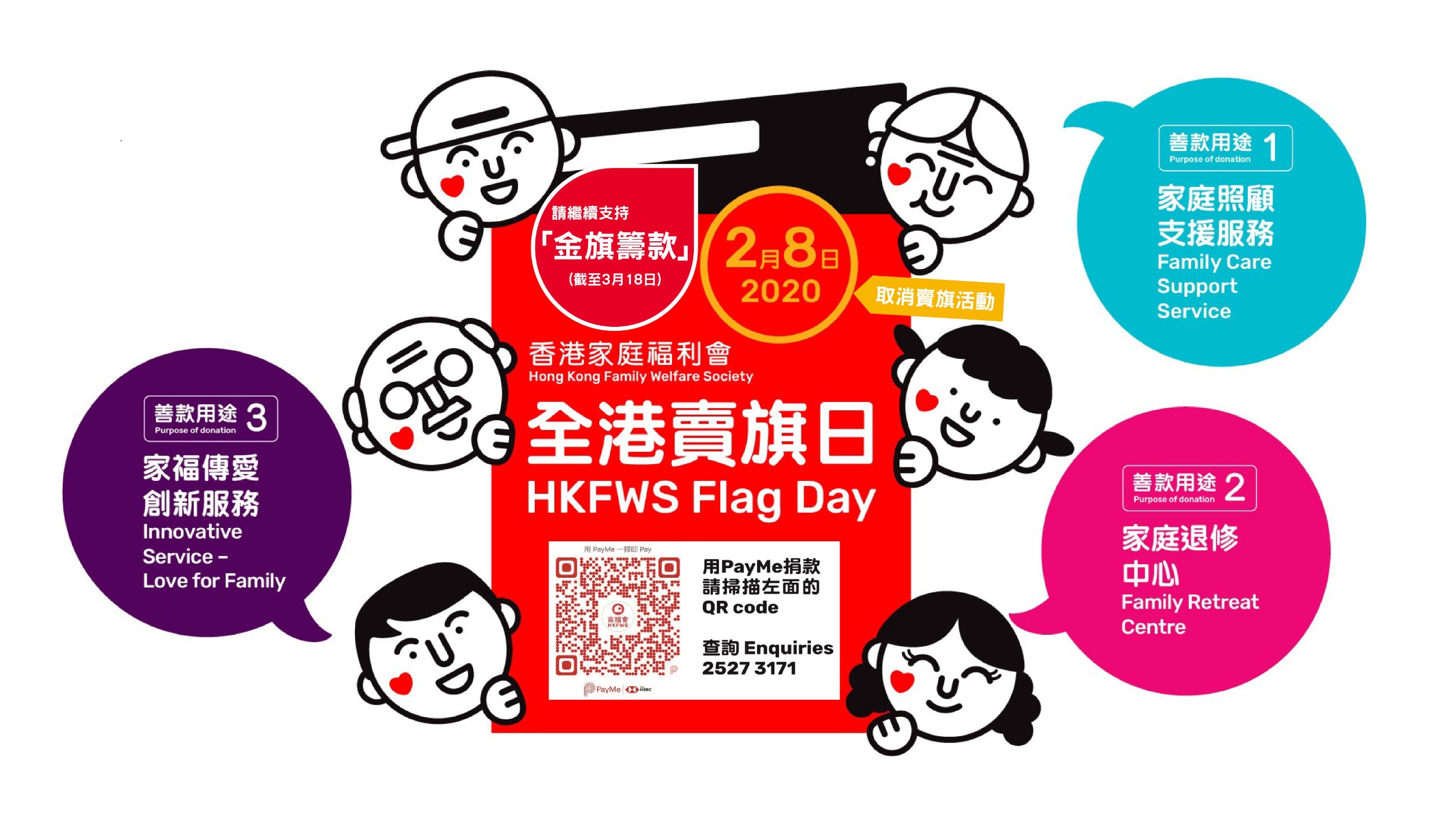 家福會全港賣旗日原定於2020年2月8日(星期六)上午舉行,但鑑於2019冠狀病毒病疫情的影響,本會決定取消當天在街上的賣旗活動,現呼籲各位善長購買金旗或透過PayMe 捐款,令更多有需要的人士受惠,收益將用於發展本會非政府資助項目,包括家福傳愛創新服務、家庭照顧支援服務及家庭退修中心。金旗及PayMe 捐款截止日期為3月18日,請各位鼎力支持。