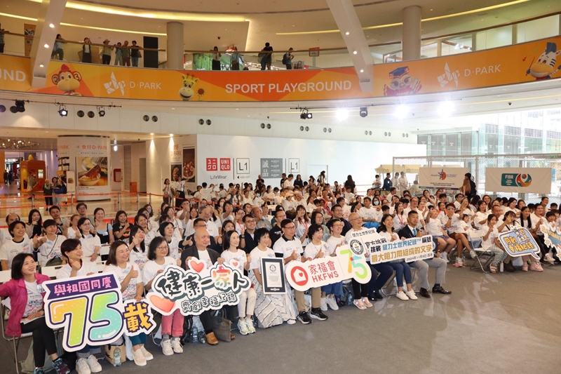 家福會於11月3日假荃灣愉景新城D • PARK舉辦「健康一家人 - 齊創幸福紀錄」活動,由眾多家庭成員合力挑戰以1,075條阻力帶拼砌出「家」字,並最終獲得健力士世界紀錄TM榮譽 -「最大阻力帶組成的文字」。本會希望讓公眾與家人享受優質家庭時光,同時促進家庭健康及提升幸福感,為一家人留下美好回憶。