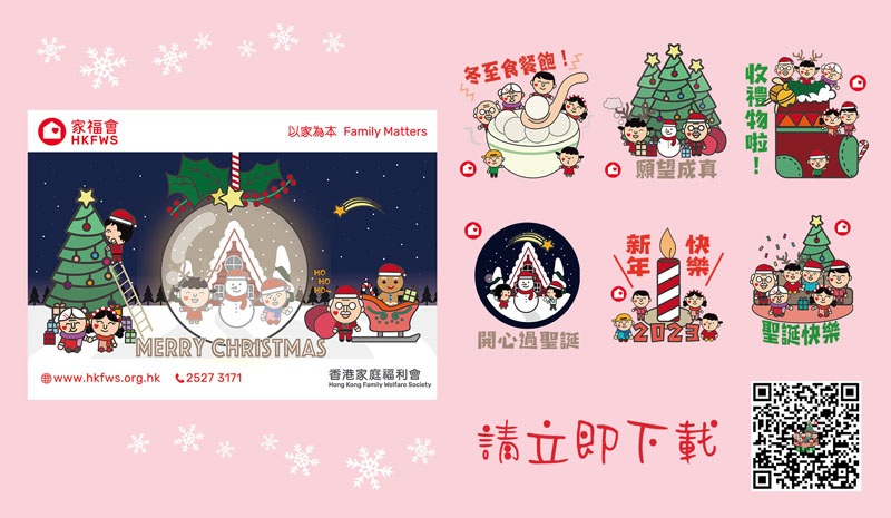 聖誕呈獻 - 「最緊要一家人」節日電子賀咭及WhatsApp / Signal sticker 十二月除了是普天同慶的聖誕節日外,也是冬至佳節慶團圓。家福會繼續為大家送上窩心的祝福,祝大家聖誕和新年快樂,最緊要一家人!大家立即下載家福會設計的WhatsApp / Signal sticker同家人和朋友互送祝福!開心share,HOHOHO!