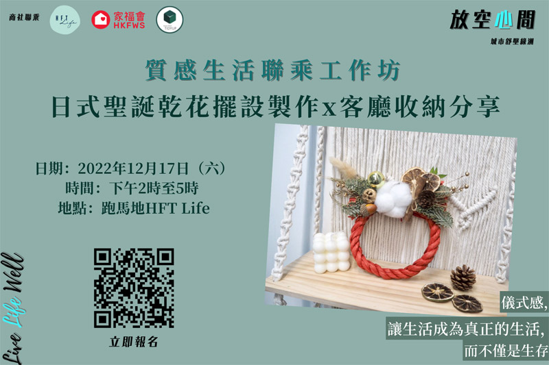 家福會 x 鴻福堂HFT Life x More Than Tidy Up舉辦聯乘工作坊 家福會「最緊要一家人」企劃聯乘鴻福堂旗下品牌HFT Life定期舉辦不同主題的工作坊,讓公眾於週末時間好好享受假期,藉此放鬆心靈。於本年10至12月期間,團隊聯同新伙伴More Than Tidy Up創辦人收納師Kaye Li舉辦「質感生活聯乘工作坊」,將手工藝體驗配合收納分享,讓參加者一邊製作專屬的作品,一邊學習不同收納技巧,多角度提升生活質素。 為迎接聖誕節,我們將於12月17日舉行「質感生活聯乘工作坊 - 日式聖誕乾花擺設製作x客廳收納分享」。透過製作充滿文青風的聖誕裝飾再配合客廳收納分享,讓大家輕鬆打造一個儀式感及舒適感俱備的生活空間。
