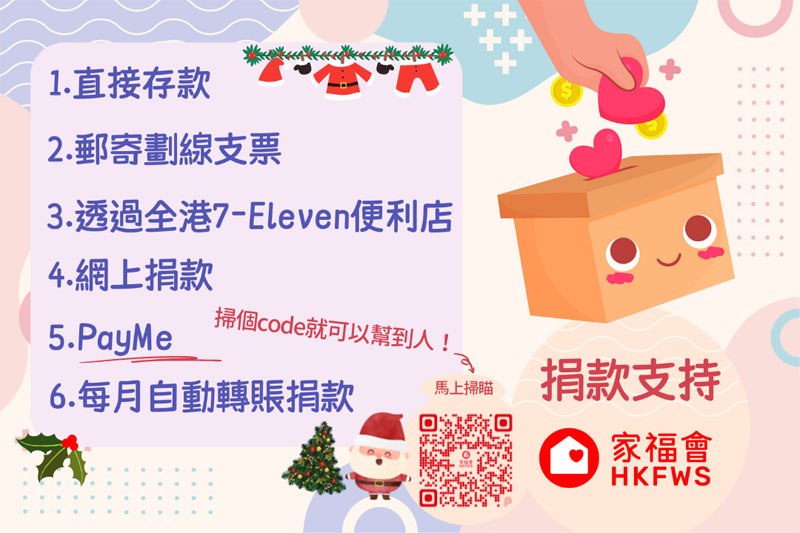 於聖誕佳節為有需要家庭送上關心及幫助 普天同慶的聖誕佳節即將到臨,在這個感恩及祝福的節日,我們鼓勵各方踴躍捐款,在歡渡節日之餘,為有需要的家庭送上關心。本會現在亦設PayMe捐款,歡迎各位透過以下方式慷慨解囊。