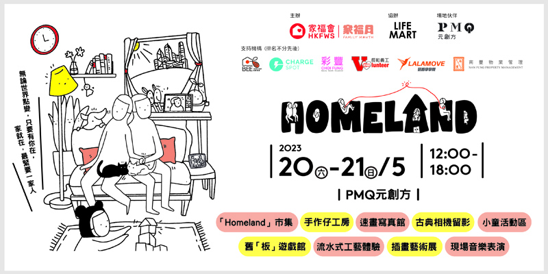 「Homeland」 家庭市集2023 - 連串精彩活動等你與家人參與 由家福會主辦,LIFE MART協辦的「Homeland」家庭市集2023將於5月20及21日於中環PMQ元創方與大家見面!市集匯聚了多個來自本地的手作品牌,更設有各類型適合大人小朋友的攤位遊戲及免費工作坊﹑速畫及古典相機留影讓你留下與家人玩樂的珍貴畫面。此外,現場亦有音樂表演以及回應家福月主題「轉變中的家庭幸福」的插畫展覽。期待你與家人前來參與一連串精彩活動,度過難忘的家庭時間。