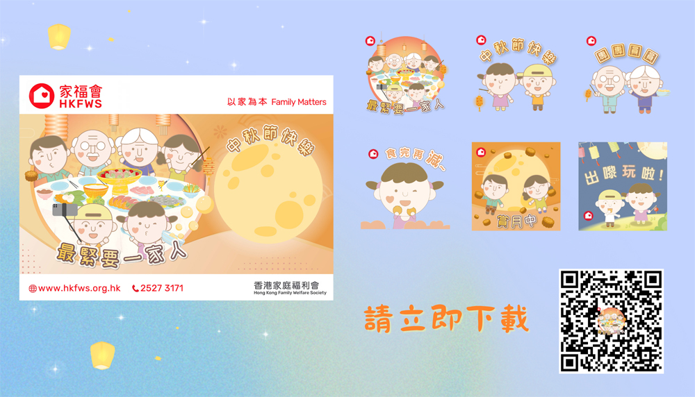 中秋呈獻 - 「最緊要一家人」電子賀咭及WhatsApp / Signal sticker 中秋佳節,家福會為大家送上暖意的祝福,祝願大家中秋節幸福美滿,團團圓圓!最緊要一家人!大家記得下載家福會設計的WhatsApp / Signal sticker同家人及親朋好友互送祝福,喜迎中秋 !