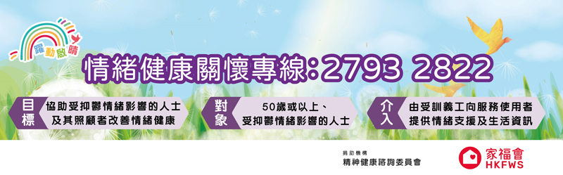 「躍動啟晴 - 情緒健康關懷專線」注入社區 家福會「躍動啟晴 - 情緒健康支援計劃」獲得精神健康諮詢委員會資助,由2022年4月至2024年3月推展情緒健康支援服務。本計劃旨在協助50歲或以上受抑鬱情緒影響的人士及其照顧者改善負面情緒,並提升社區人士對長者情緒健康及照顧者需要的關注。計劃正推行情緒健康熱線支援服務,由受訓義工向服務使用者提供情緒支援及生活資訊。如有需要,歡迎致電向計劃職員查詢或申請服務!