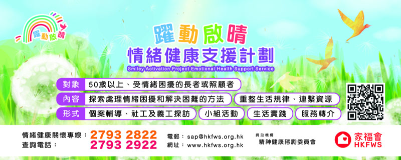 家福會「躍動啟晴 - 情緒健康支援計劃」獲得精神健康諮詢委員會資助,由本年4月至2024年3月推展情緒健康支援服務。計劃旨在協助50歲或以上受抑鬱徵狀影響的人士及其照顧者重建社區連繫、開展愉快活動、加強解決問題的能力,從而改善負面情緒,建立照顧雙方的正向互動,並提升社區人士關注長者的情緒健康及照顧者的需要。計劃內容包括「情緒健康管理計劃」(個案服務)、「情緒健康關懷專線」、社交心理活動、教育活動及義工服務等。
