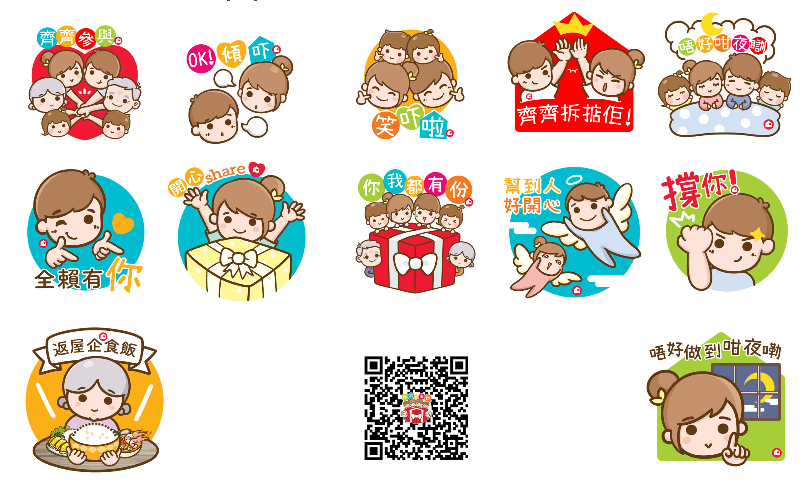由插畫師Dear me, 特別為家福會設計的「家庭幸福系列 1」 一套12款的 WhatsApp Stickers,配以由家福會同事提供的溫馨語句,讓家人可以互相傳情達意,提升家庭幸福.。