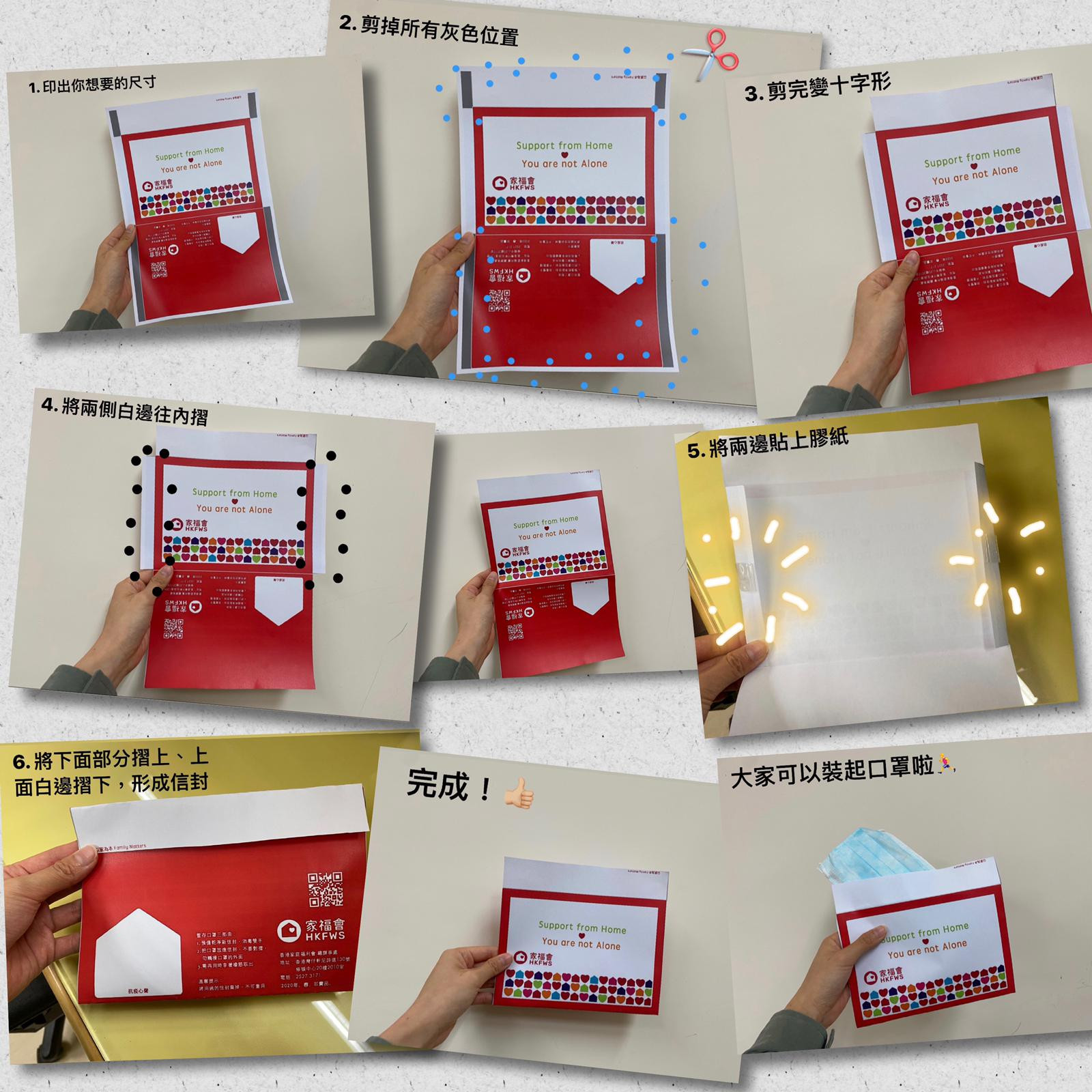 有醫生表示,若評估身處的環境感染風險較低,可將口罩放入乾淨信封暫存後再用。家福會為了與大家一起抗疫,準備了精美的口罩套自製版,大家可下載喜歡的圖樣,自製屬於自己的口罩套。
