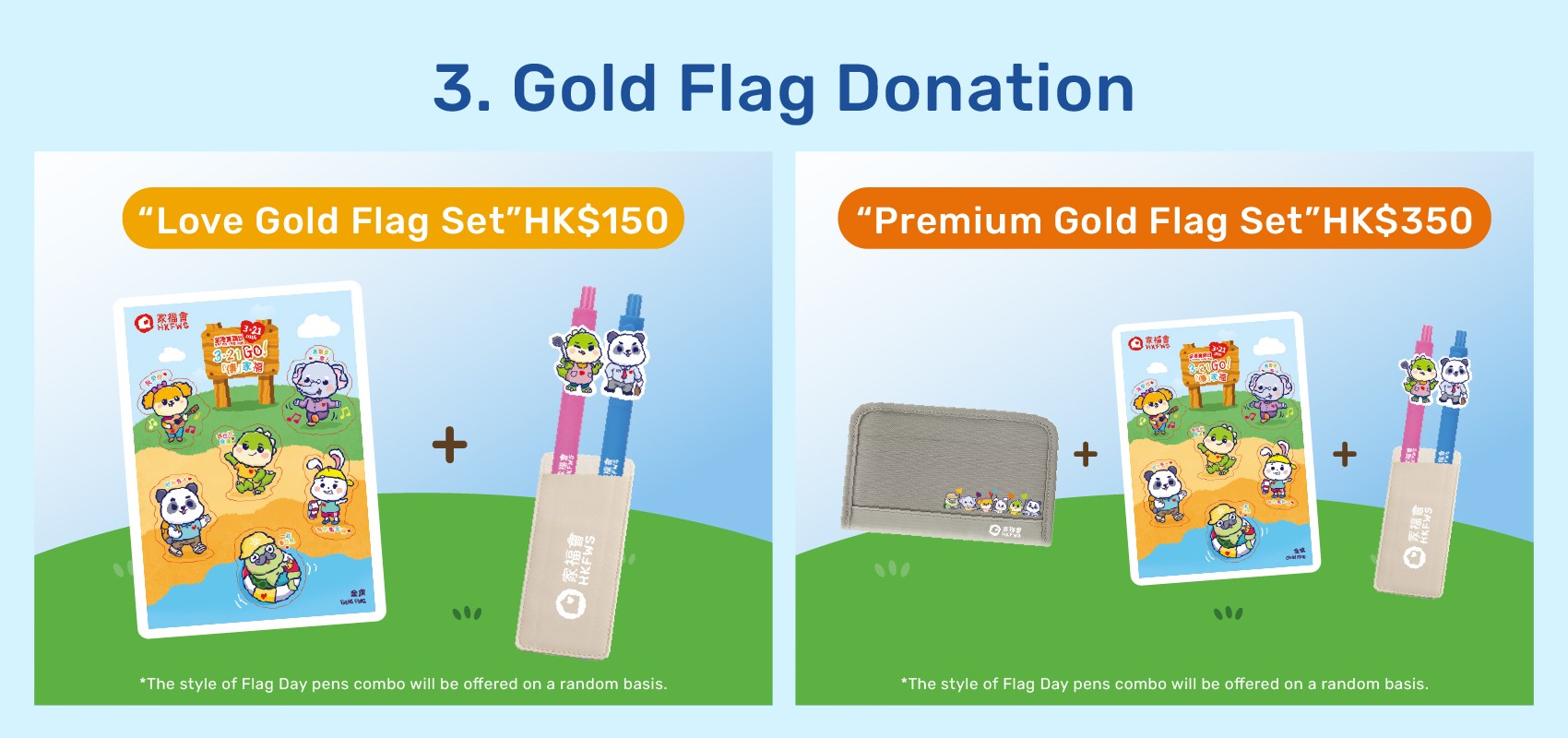 We have specially designed two exquisite Gold Flag sets. We sincerely invite you to support us by Gold Flag Donation and help spread the message of "Family Wellbeing".