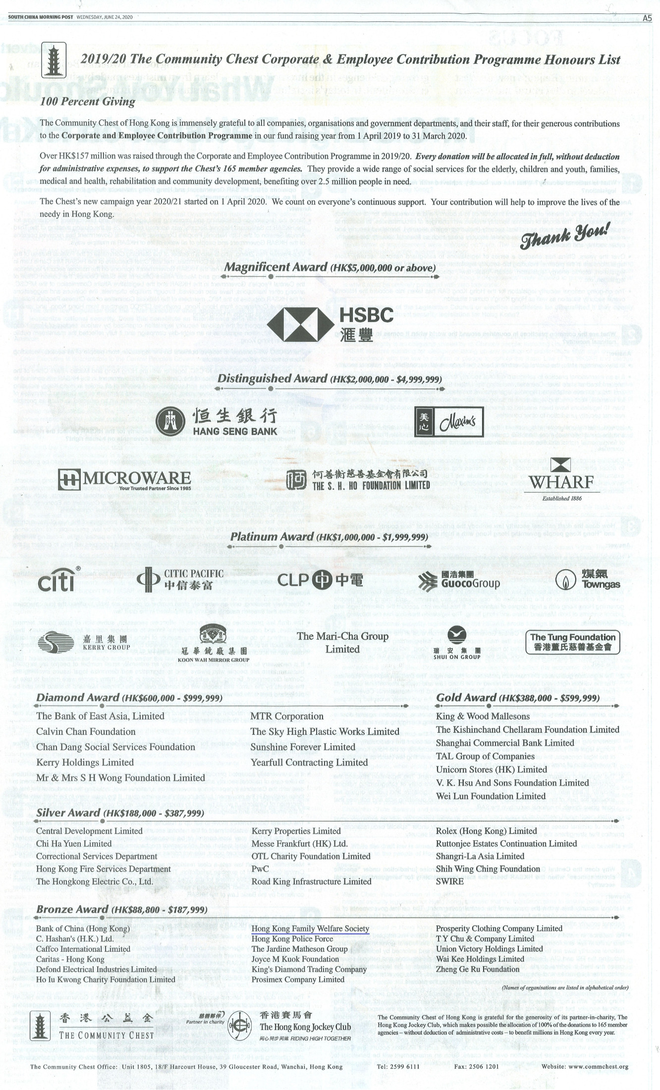 2019/20 The Community Chest Corporate & Employee Contribution Programme Honours List