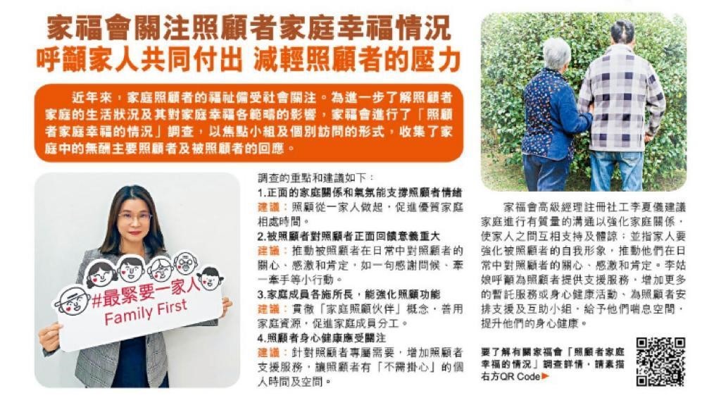 家福會關注照顧者家庭幸福情況 呼籲家人共同付出 減輕照顧者的壓力