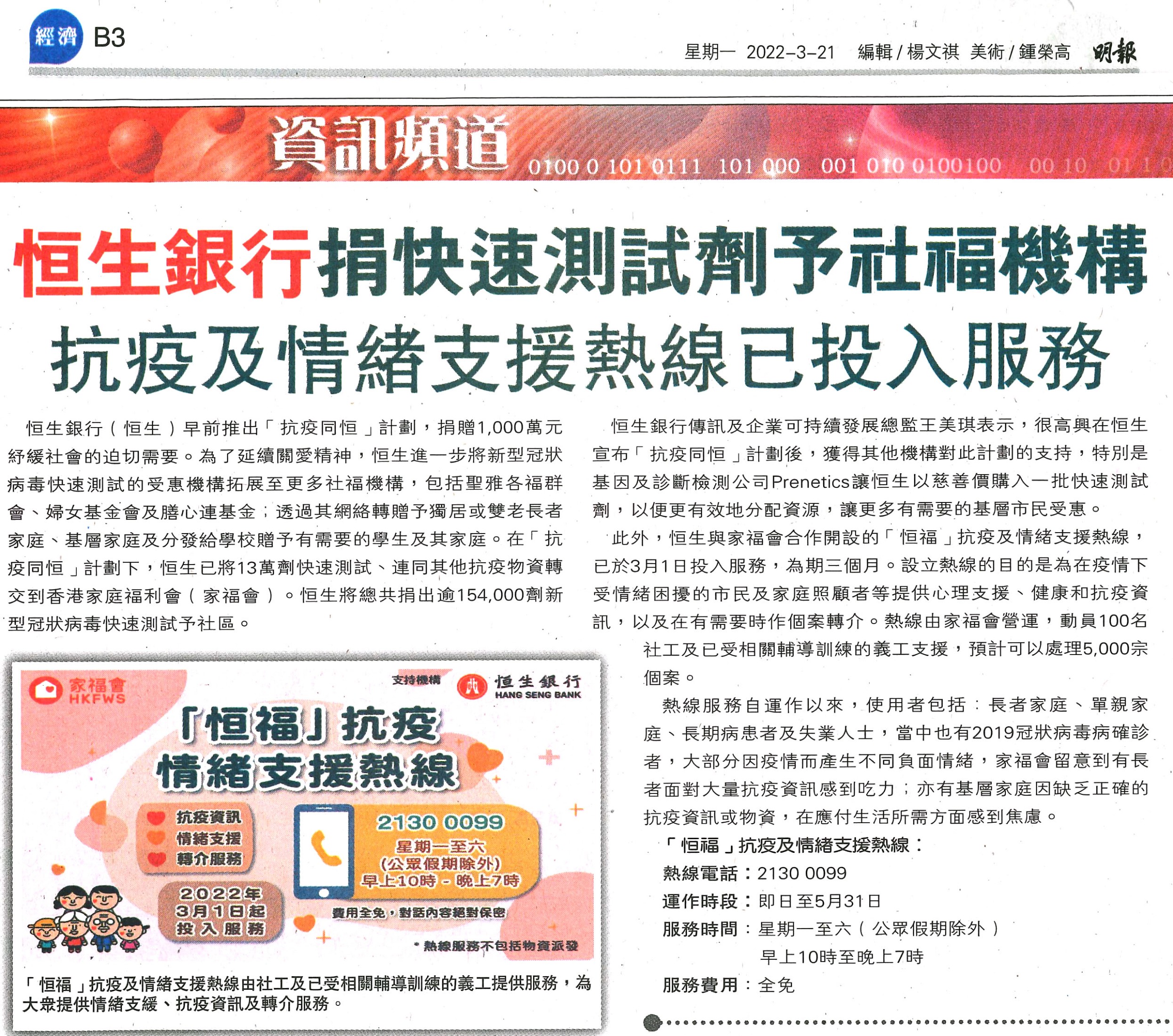 恒生銀行捐快速測試劑予社福機構 抗疫及情緒支援熱線已投入服務