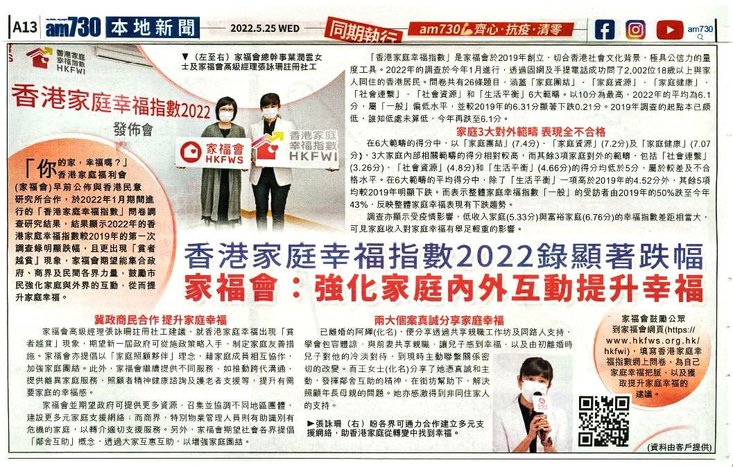 香港家庭幸福指數2022錄顯著跌幅 家福會:強化家庭內外互動提升幸福