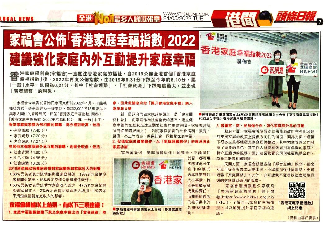 家福會公佈「香港家庭幸福指數」2022 建議強化家庭內外互動提升家庭幸福