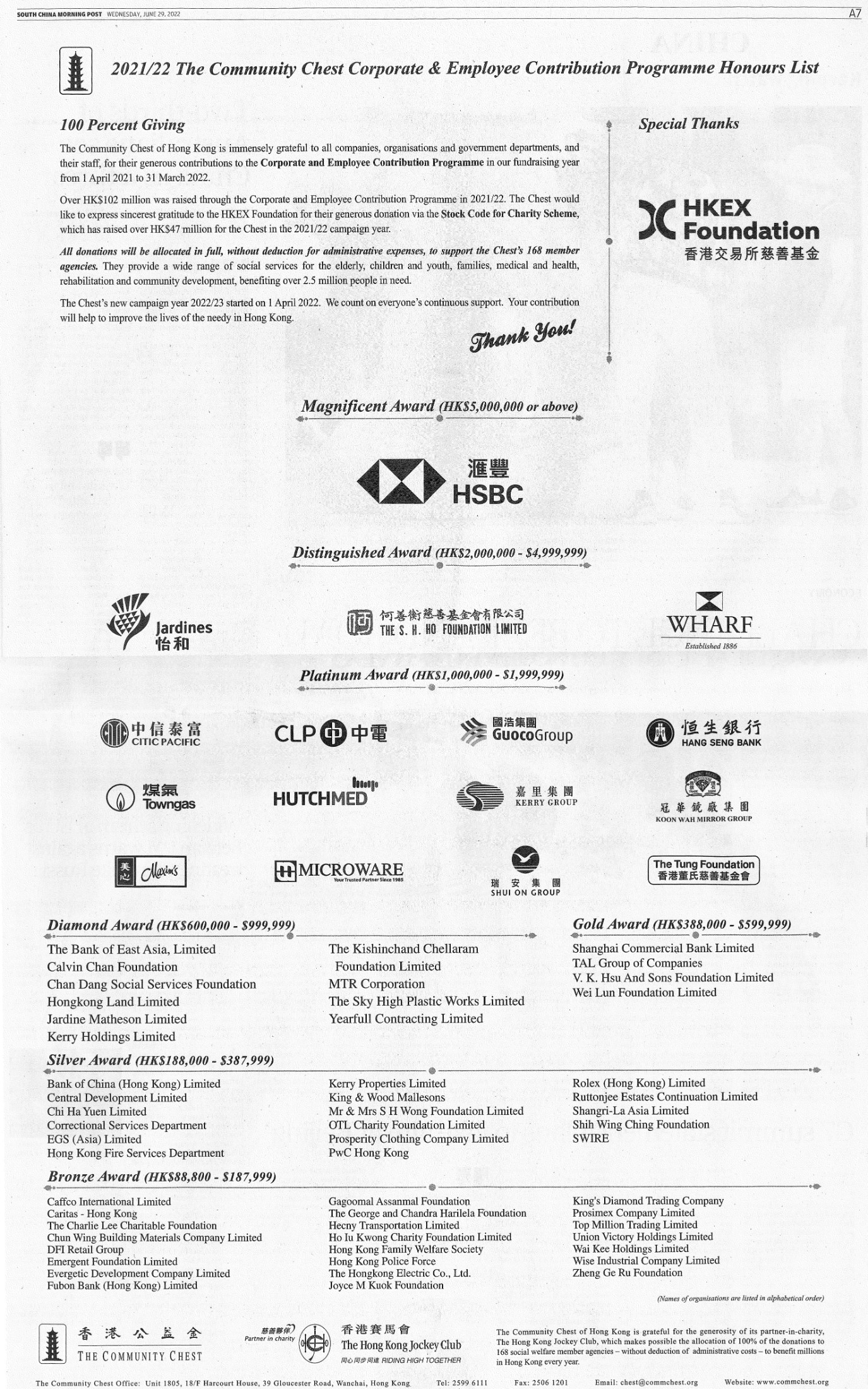 2021/22 The Community Chest Corporate & Employee Contribution Programe Honours List