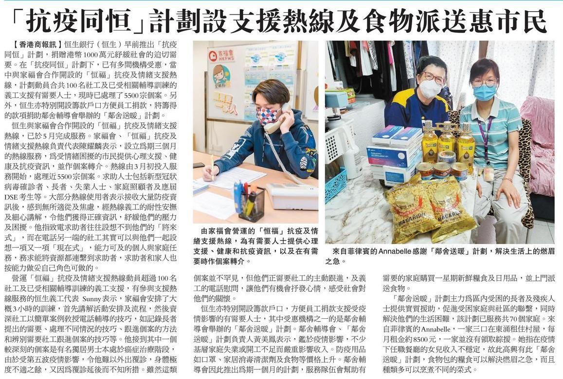 「抗疫同恒」計劃設支援熱線及食物派送惠市民
