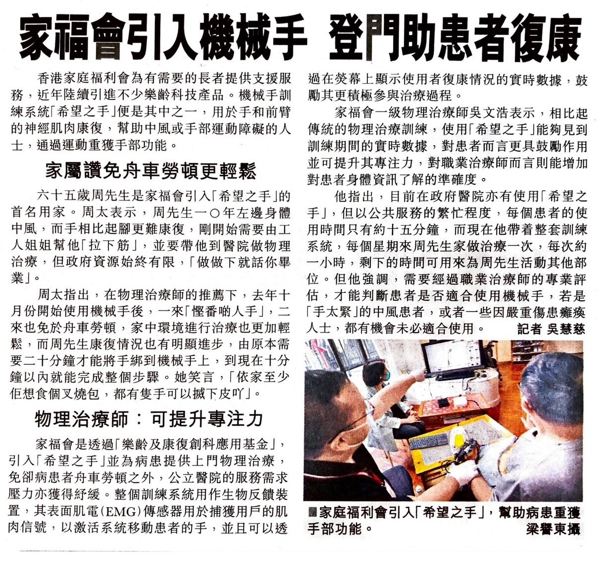 六十五歲周先生是家福會引入「希望之手」的首名用家。周太表示,周先生一○年左邊身體中風,而手相比起腳更難康復,剛開始需要由工人姐姐幫他「拉下筋」,並要帶他到醫院做物理治療,但政府資源始終有限,「做做下就話你畢業」。