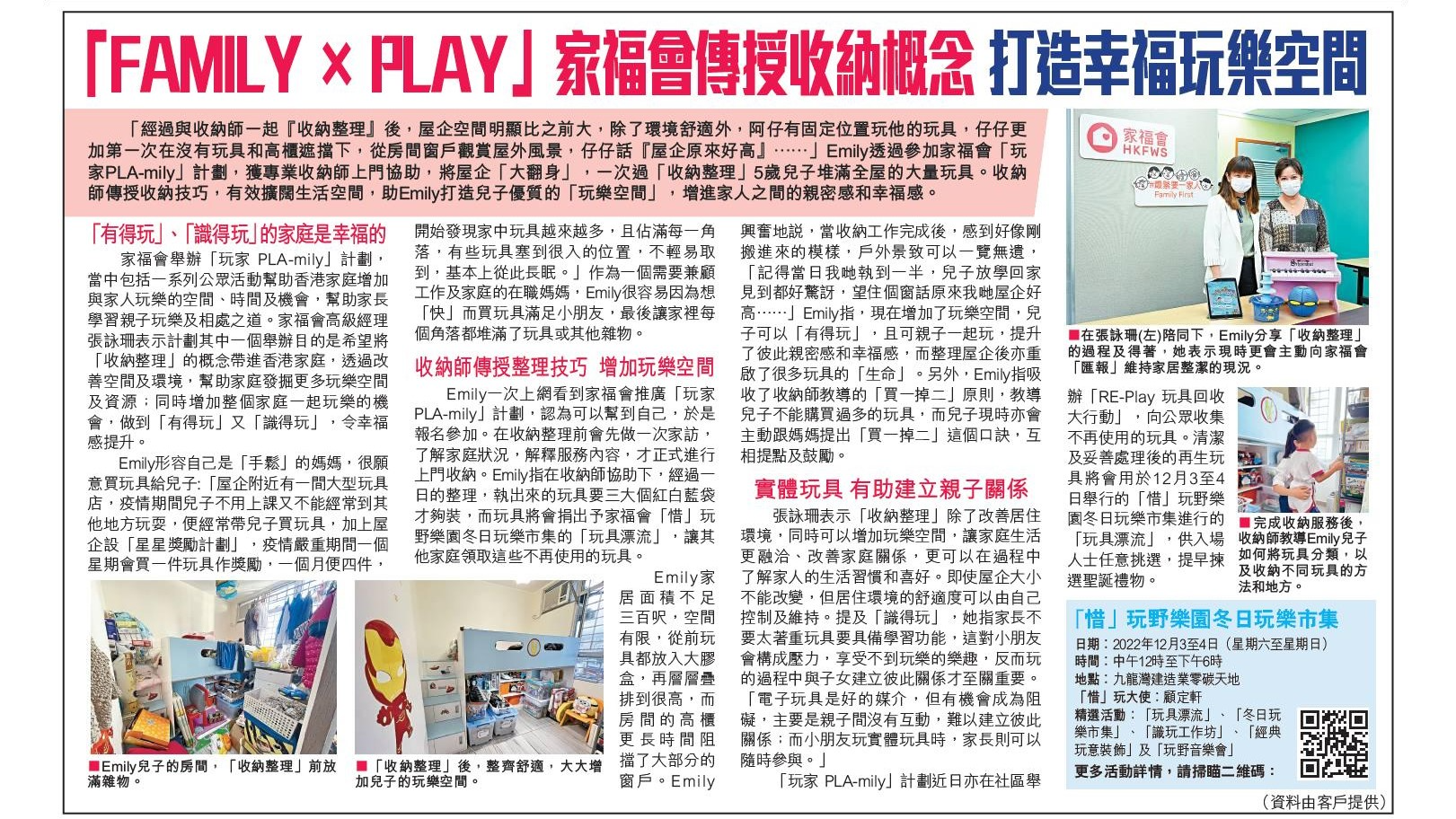 家福會舉辦「玩家 PLA-mily」計劃,當中包括一系列公眾活動幫助香港家庭增加與家人玩樂的空間、時間及機會,幫助家長學習親子玩樂及相處之道。家福會高級經理張詠珊表示計劃其中一個舉辦目的是希望將「收納整理」的概念帶進香港家庭,透過改善空間及環境,幫助家庭發掘更多玩樂空間及資源;同時增加整個家庭一起玩樂的機會,做到「有得玩」又「識得玩」,令幸福感提升。