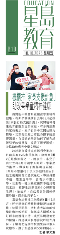 機構推「家長支援計劃」 助改善學童精神健康