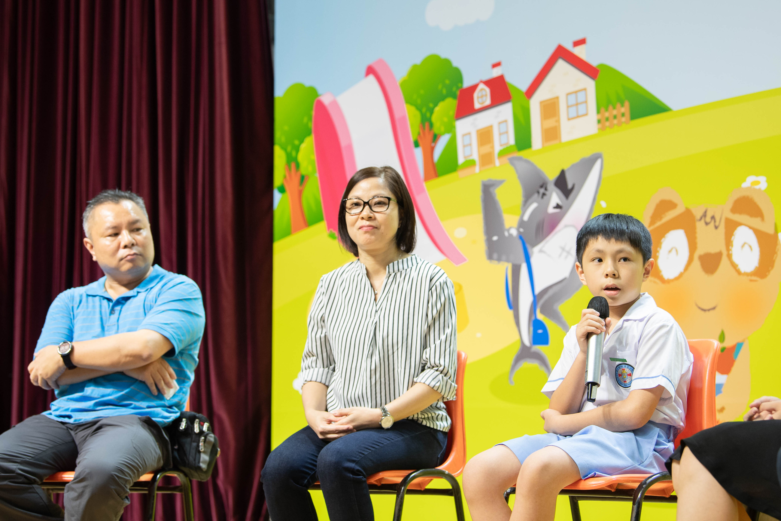 「小學朋輩調解員」黃柏仁(右)與父母及駐校社工一起分享參與計劃的得著。