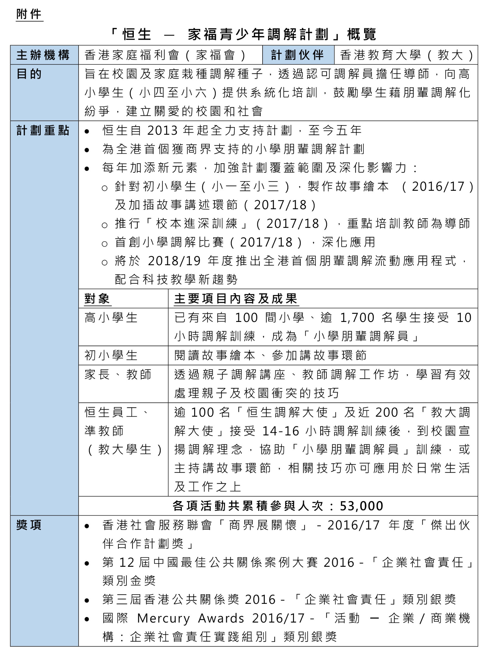 附件:「恒生 - 家福青少年調解計劃」概覽