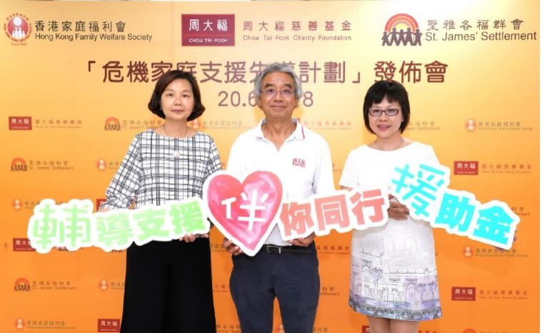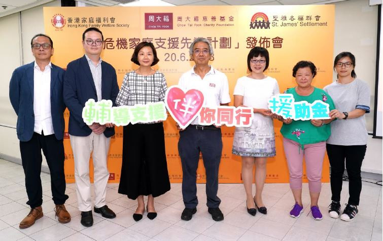周大福慈善基金主席鄭家成先生(中)、聖雅各福群會總幹事李玉芝女士(左三)、香港家庭福利會總幹事葉潤雲女士(右三)、香港社會服務聯會總主任(社會發展)黃子瑋先生(左二)、香港理工大學應用社會科學系何國良博士 (左一)、受助人同女士(右二)及袁女士(右一)鼓勵基層家庭遇上突然變故時主動尋求協助。