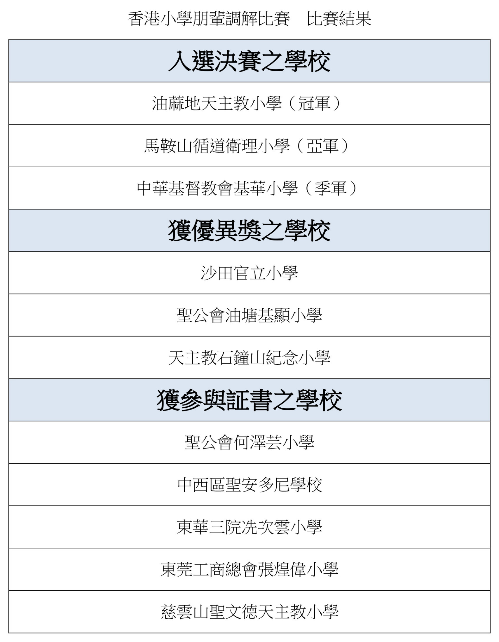 全港首屆「香港小學朋輩調解比賽」決賽的冠軍由油蔴地天主教小學獲得。