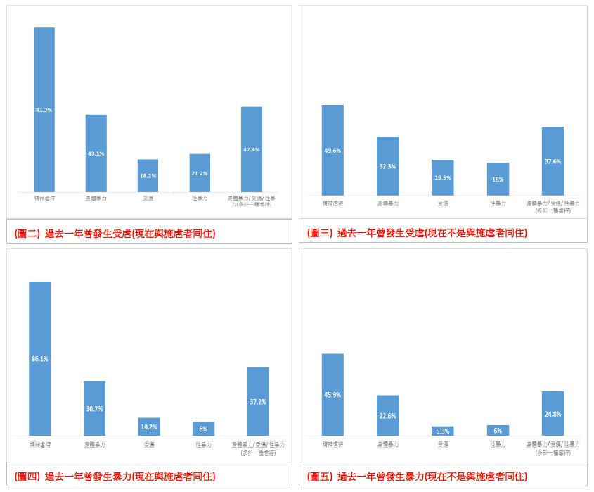 非與施虐者同住的婦女比現與施虐者同住的婦女,明顯有較多經歷過不同類型的虐待,包括身體、精神方面、性要脅等,這反映非與施虐者同住的婦女因經歷了較多的暴力而決定離開施虐者,不再同住。可是,結果顯示,即使離開了施虐者,有些施虐者仍會尋找婦女的居所、工作環境等作出騷擾,甚或跟蹤,或透過探視子女及贍養費等安排時,出現不同形式的暴力等,令受虐者未能脫離暴力。