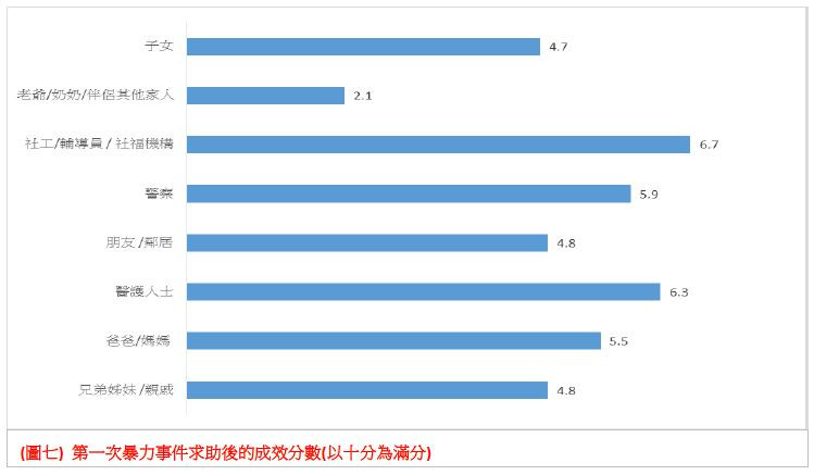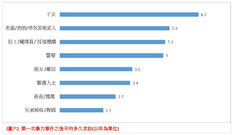 調查結果顯示受訪者首次經歷伴侶向自己使用暴力事件,距離今(舉報時間)平均有8.7年。「家醜不出外傳」的想法,令受虐者拖延了較長時間才能鼓起勇氣求助。在第一次暴力事件發生後,平均須於2.1年及2.7年後才會向兄弟姊妹/親戚及父母透露情況及求助;平均5年後才找專業人士,如社工/輔導員/社福機構/警察求助。求助成效方面,調查結果顯示,受虐者認為向專業人士,如社工/輔導員/社福機構/警察求助,比父母、兄弟姊妹/親戚更有效處理其家庭問題。