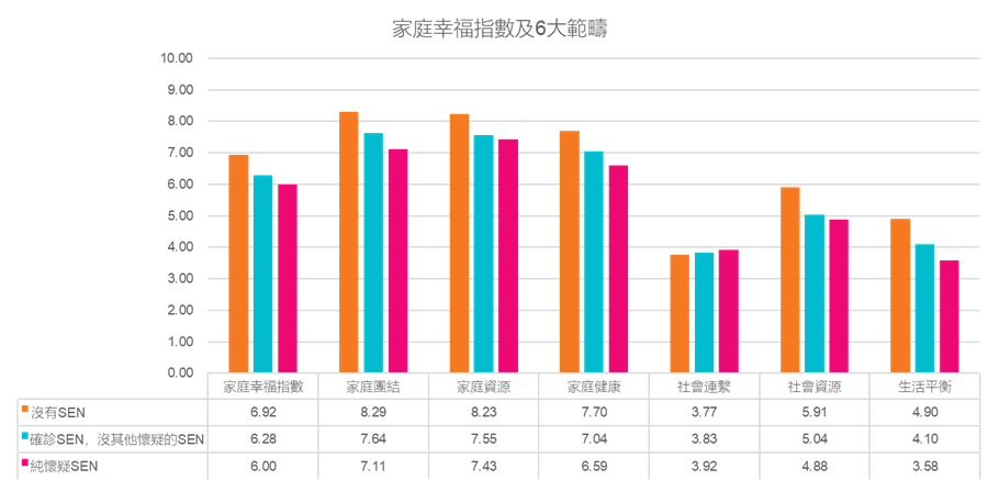受訪家庭中有67%家中沒有懷疑或已診斷的SEN子女,這些家庭的「家庭幸福指數」為6.92分,家中有已診斷SEN子女的,其「家庭幸福指數」為6.28分。相信有已診斷SEN子女的家庭所面對的挑戰,會影響其家庭幸福。然而,懷疑子女有SEN而未獲確診的家庭,在家庭幸福及親職教養方面,都較子女已確診為SEN的家庭更差或不理想;而懷疑子女有SEN的家庭,其「家庭幸福指數」只有6分,打罵等消極教養行為亦明顯較其他家庭多。此數據反映出,懷疑子女有SEN而未獲確診的家庭,其需要確實不容忽視。