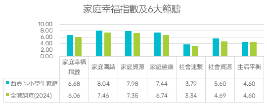 調查顯示,受訪者自評家庭團結、家庭資源、家庭健康、社會連繫、社會資源等範疇的分數,都較全港家庭(最新2024年數據)為高,只有生活平衡分數與全港相同,歸納得出受訪西貢區小學生家庭的「家庭幸福指數」達6.68分(10分為滿分),比全港的6.06分高0.62分,當中「家庭資源」和「社會資源」的分數,比全港分數分別高0.63和0.91分,顯示西貢區小學生家庭,不論家庭內的資源,或有需要時取得親朋 或社區的幫助,都較為理想。