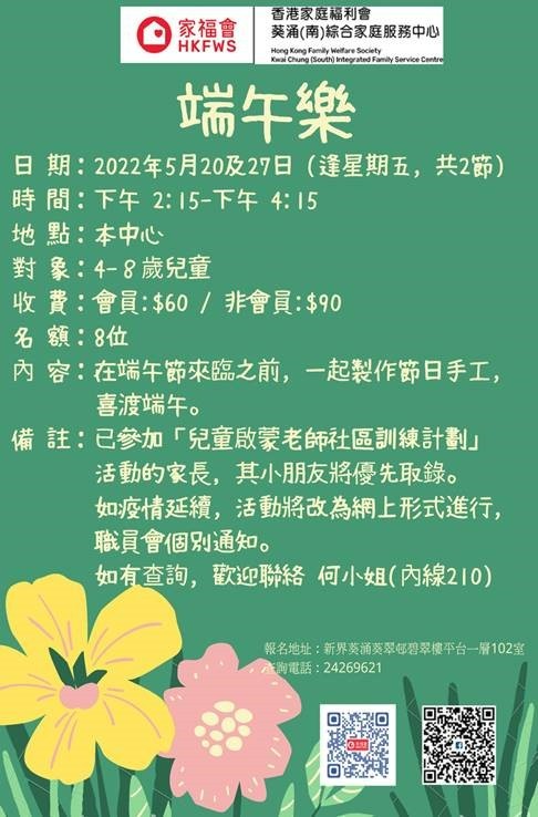 - 已報名參加的家庭其小朋友可優先參加同一時段的 「20/5 & 27/5端午樂」活動 (活動詳請可參閱以下海報)。