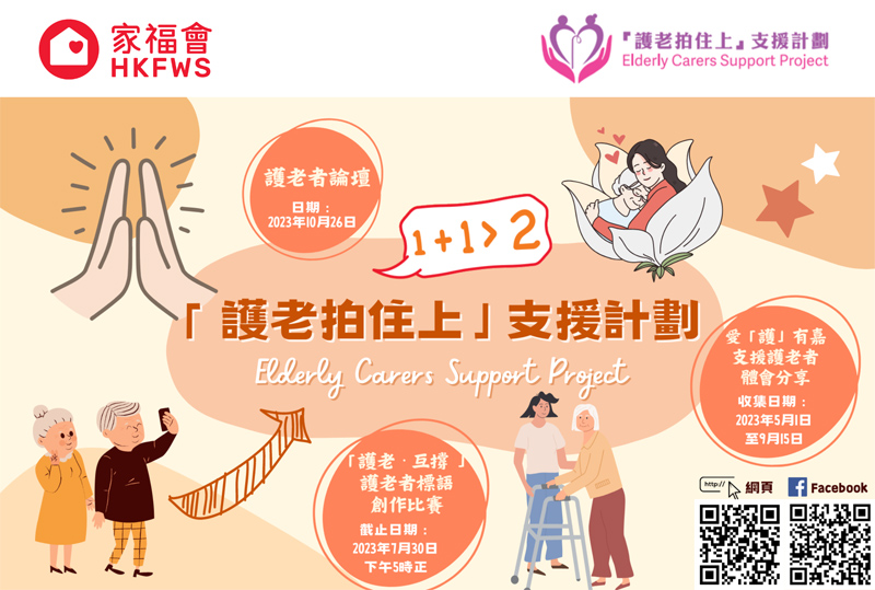 「護老拍住上」支援計劃 家福會的長者服務於2022年起推行「護老拍住上」一系列護老者支援服務,以「為護老者集氣!1+1>2」為主題,呼籲每一個支援護老者的我們,攜手建立一個護老者友善的社會,發揮一加一大於二的影響力。今年再次推出「護老拍住上」支援計劃,並以土瓜灣為試點,希望透過各種活動及宣傳,喚起社會各界關注護老者的需要及提供支援,一起為護老者集氣,而護老者可以透過參與計劃活動,短暫放低照顧壓力,認識更多同路人。