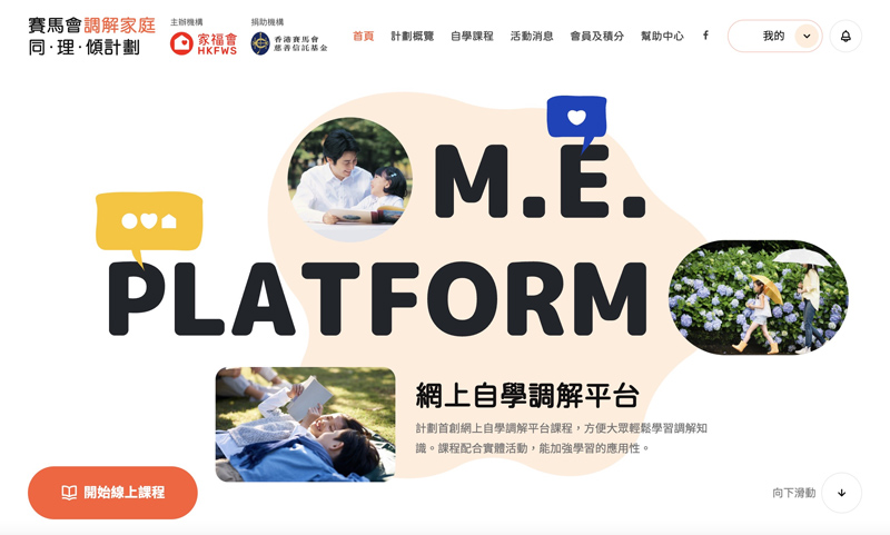 全港首個網上自學調解平台 集「免費會員+輕鬆學習+積分換領」於一身 由家福會主辦,香港賽馬會慈善信託基金捐助的「賽馬會調解家庭同•理•傾計劃」(Happy Family with M.E.) 於2023年5月推出,計劃首創「網上自學調解平台」。自學課程透過生動講解、專家分享、互動遊戲及影片教授調解知識及技巧,讓家長和子女一同以有趣及便利的方式學習,掌握實用資訊。課程更配合實體活動,以加強學習的應用性,藉此培養和諧正面的家庭關係。歡迎家長和3至16歲的兒童及青少年登記成為會員,透過參加免費網上課程及活動可獲取積分換領精美禮品,更有機會取得「調解家庭」證書及資格。