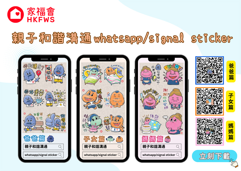 家福中心推出「家福會共親恐龍 - 親子和諧溝通」WhatsApp / Signal Sticker 隨疫情減退,人與人重啟連結,不論同住或是非同住家長也為親子關係的修復與鞏固而惆悵。家福中心特意為離異家庭設計了一系列「家福會共親恐龍 - 親子和諧溝通 WhatsApp / Signal sticker」,爸爸、媽媽和子女各自有一套30個的專屬Stickers,向重要的人表達關心與支持,講出心底說話,讓彼此打破隔閡,守護重要的關係!