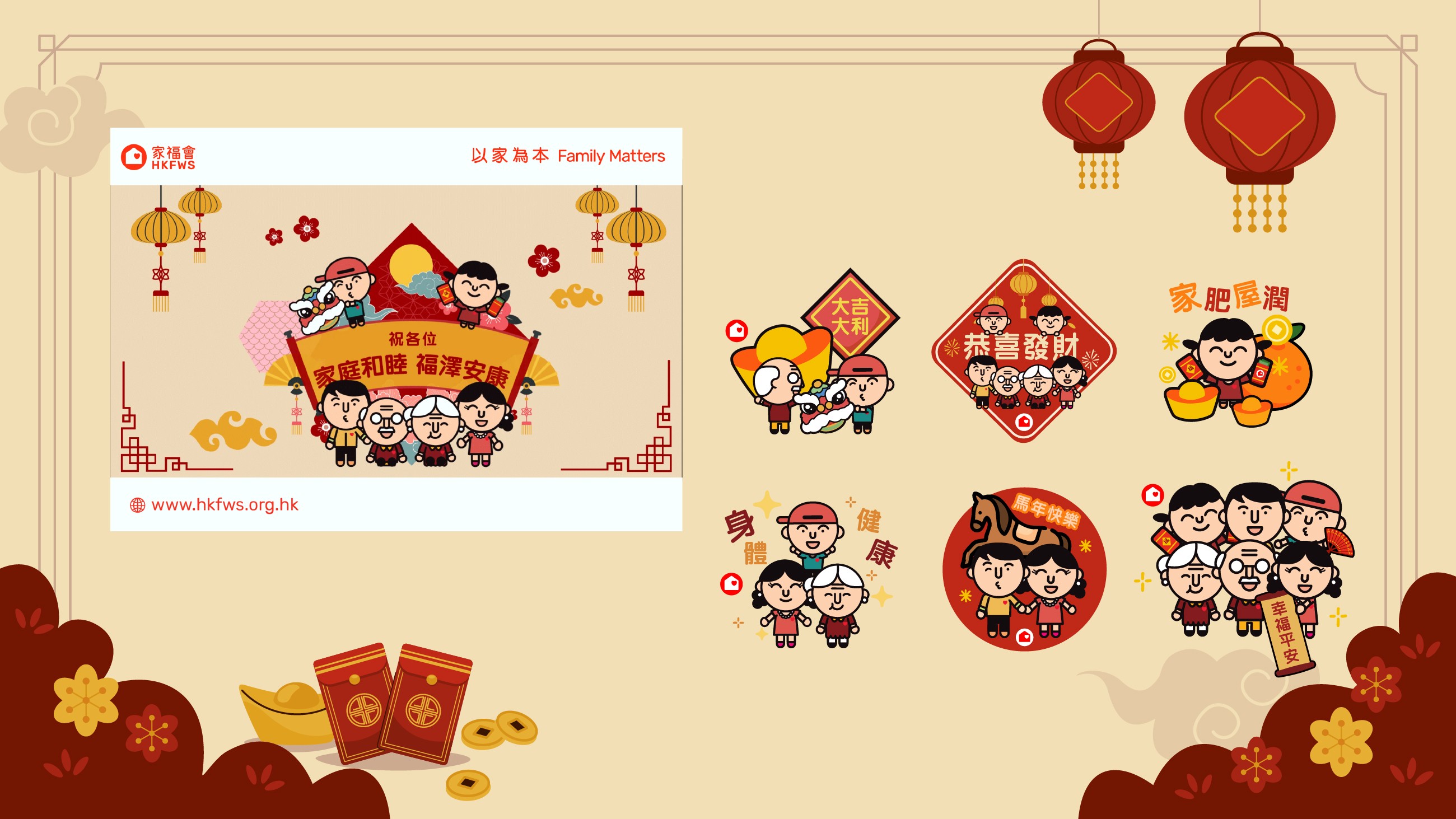新春將至,家福會推出賀年電子賀咭及WhatsApp / Signal App Stickers,歡迎轉發至親朋好友,同賀新春!是次賀咭及App Stickers以「福迎新春」為主題,為農曆新年添氣氛。立即下載,搶先為親朋好友送上溫暖祝福!祝願家庭和睦!