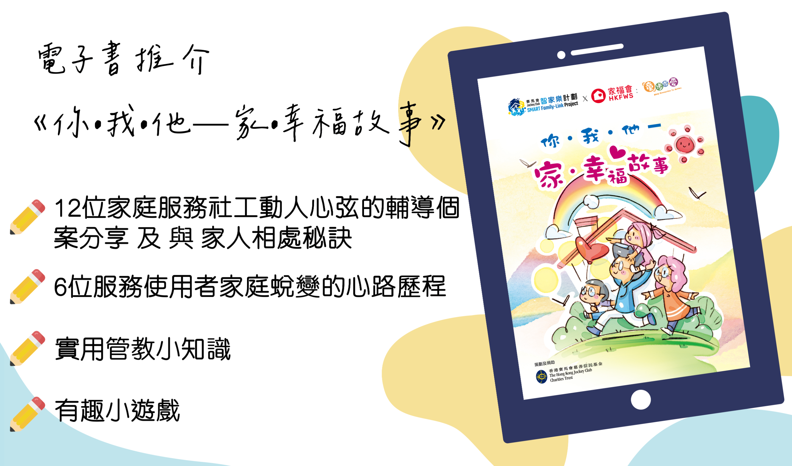 家福會「『童』步家•愛」計劃聯乘「賽馬會智家樂計劃」推出讀本—《你•我•他 — 家•幸福故事》,結集12位家庭服務社工動人心弦的輔導個案分享,以及與家人相處之道,同時收錄了6位服務使用者家庭蛻變的心路歷程,讓讀者透過此書,一同細味他們家庭故事中的喜與樂。