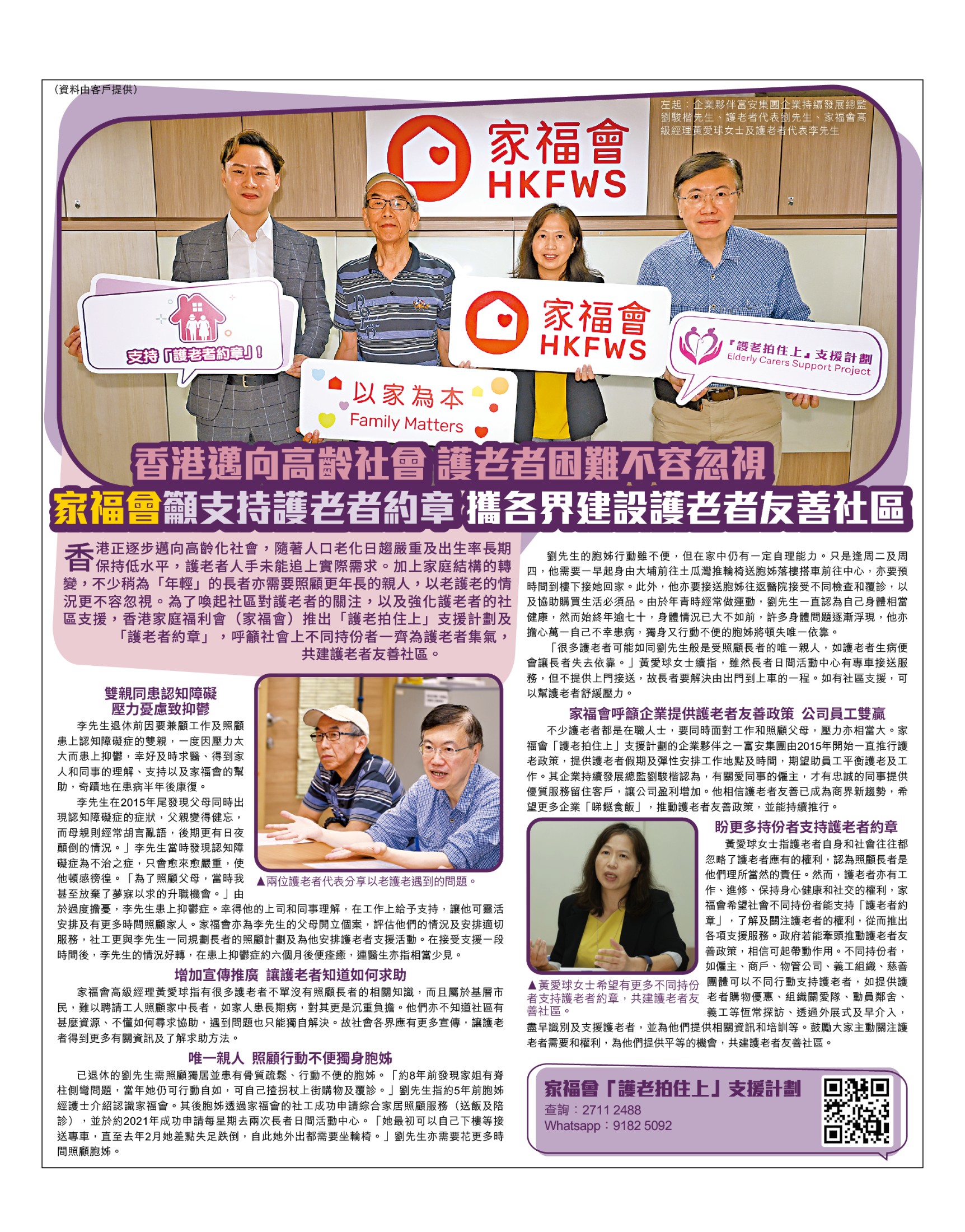 香港邁向高齡社會 護老者困難不容忽視 家福會籲支持護老者約章 攜各界建設護老者友善社區