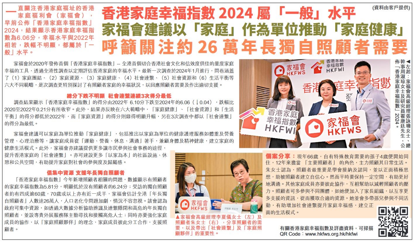 香港家庭幸福指數2024屬「一般」水平 家福會建議以「家庭」作為單位推動「家庭健康」 呼籲關注約26萬年長獨自照顧者需要