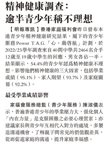 精神健康調查:逾半青少年稱不理想