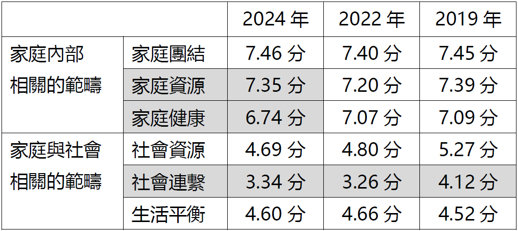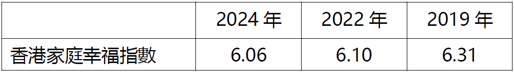1. 「香港家庭幸福指數」2024的分數為6.06分,數據顯示香港家庭幸福水平與2022年相若,跌幅不明顯